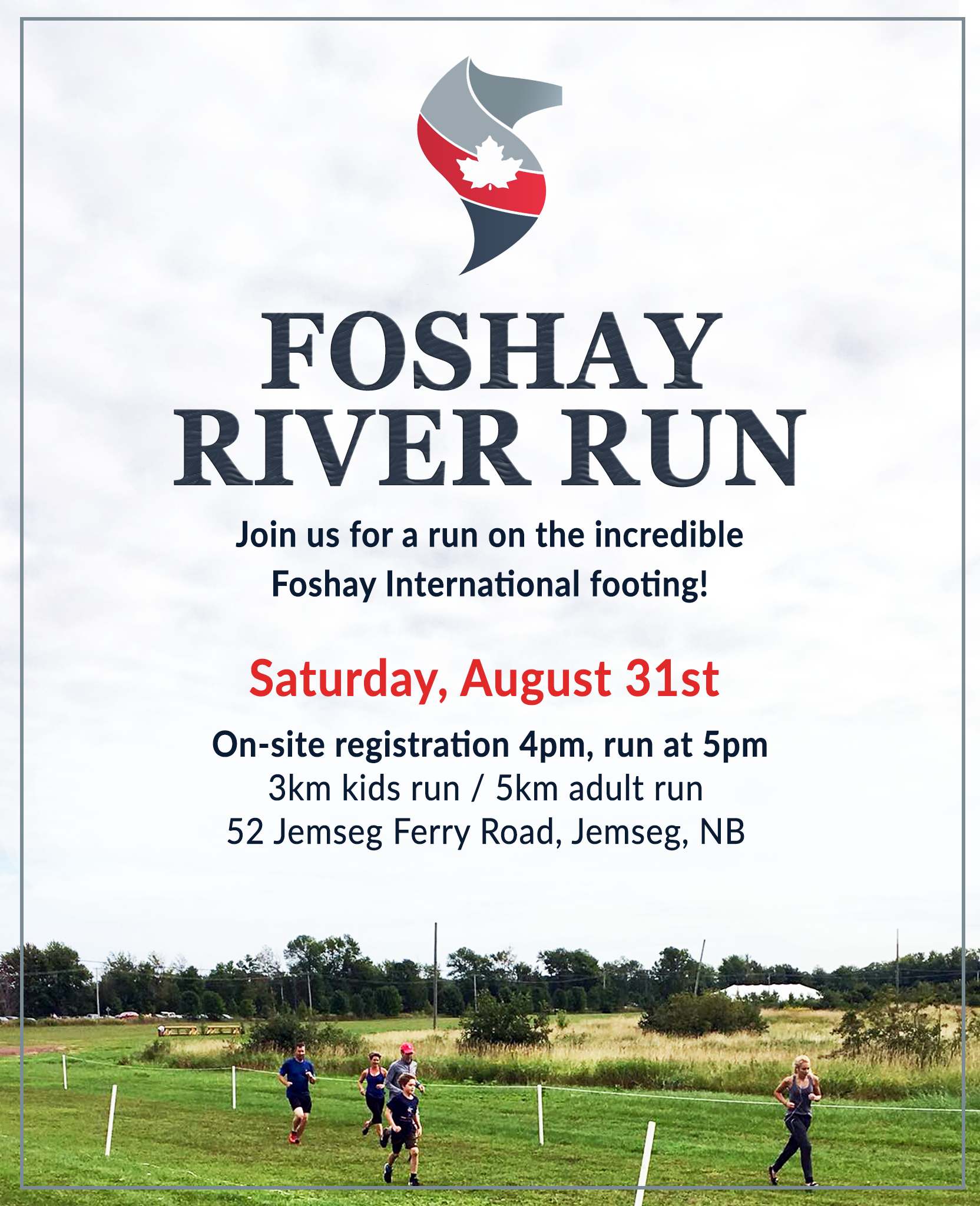 Course description: Join us for a fun run on the amazing Foshay grass footing! 3km and 5km distances will be offered. Registration on-site at 4pm. Race starting at 5pm.